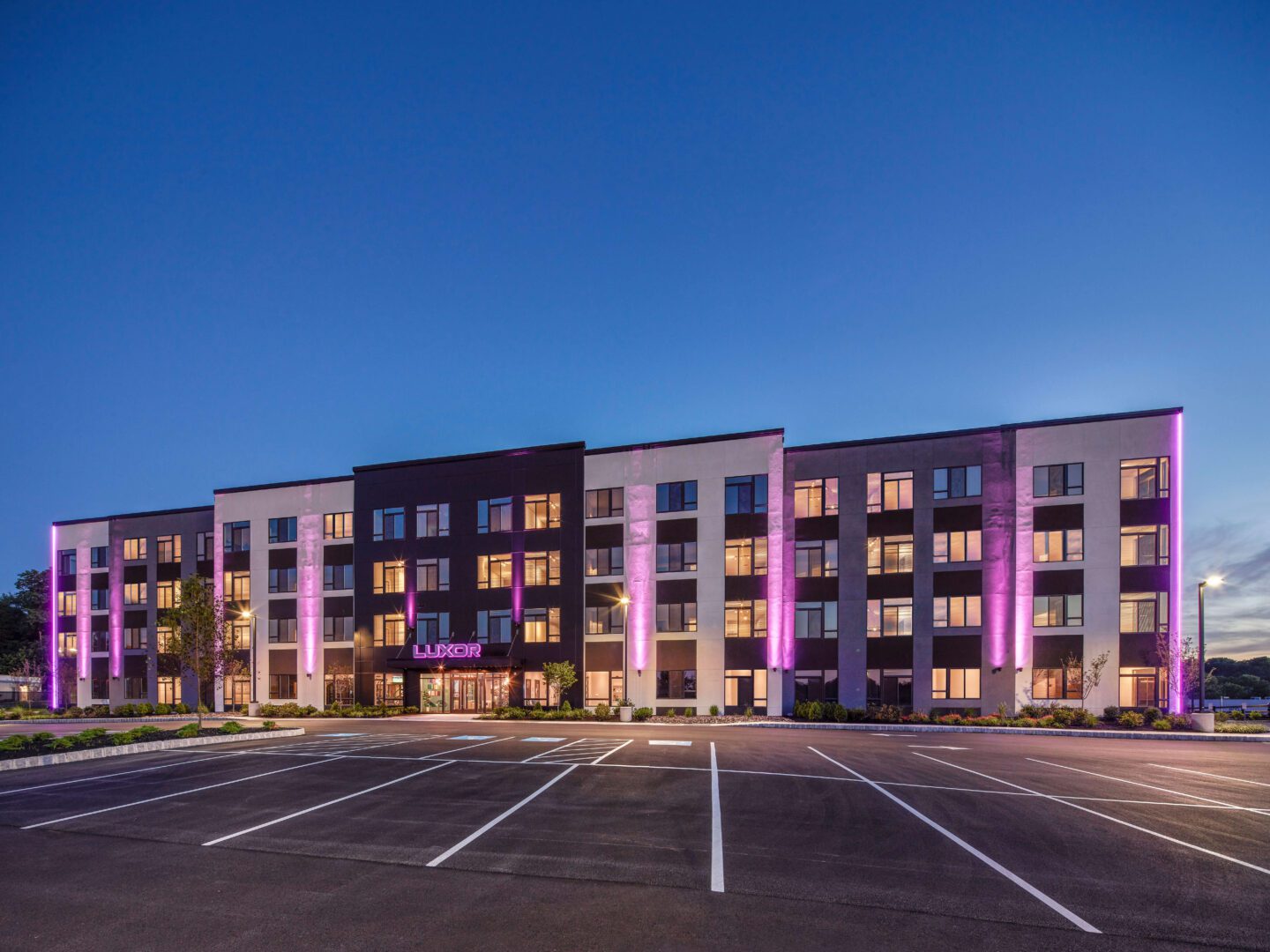 A hotel with purple lights and a parking lot. A hotel with purple lights and a parking lot.